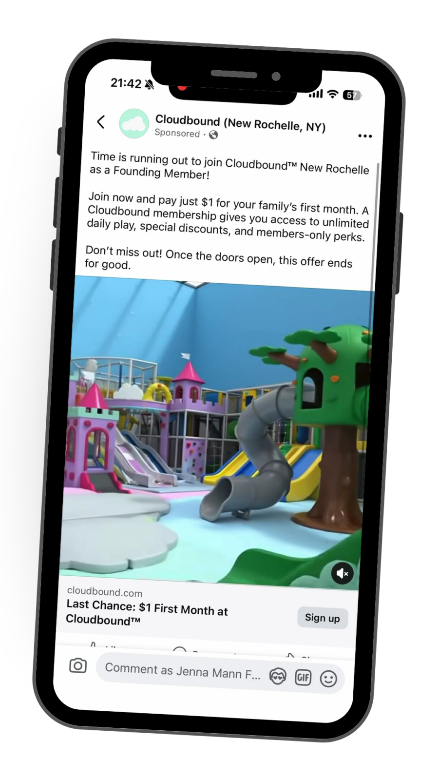 Our New Park Opening strategy leans into paid digital placements, meeting parents on their preferred platforms for learning about new things to do in their community. We relied on media that looks and feels like what parents would naturally engage with on these platforms to tell and sell the story of Cloudbound along with conceptual art to sell these memberships before any real picturs of the playspace existed.